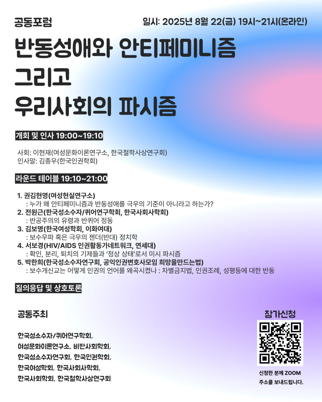 주최: 한국성소수자/퀴어연구학회, 여성문화이론연구소, 한국성소수자연구회, 한국인권학회, 한국여성학회, 사회사학연구회, 한국사회학회, 한국철학사상연구회, 비판사회학회